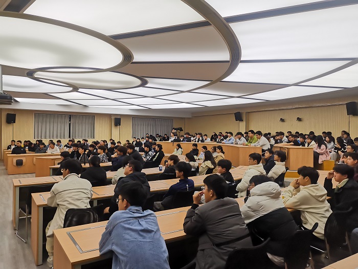 王爱伟以“从校园到星辰大海——我的成长突围之路”为题,结合个人成长经历,从“初心归来-我的校园与职场序章”“成长轨迹-从迷茫到坚定的突围之路”“干货锦囊-学业・时间・职业三重赋能”“感恩寄语-共赴未来之约”四个篇章回顾过往、启迪未来,强调了岗位所需的专业知识、能力素质和工作经验,从学业管理、时间管理、职业规划三个方面对同学们提出了提前布局未来的具体实施方案,叮嘱同学们要做一个懂得感恩、积极向上、有目标、敢行动、善复盘的追光者。在互动提问环节,王爱伟围绕专业技能提升、方向选择、考研与就业等多方面话题与同学们进行了深入交流,他说:“人生没有白走的路,每一步都算数,今天的我,离不开当年在母校踩过的坑、遇过的光,母校给我的不仅是知识,更是面对未知的勇气,十年前母校给我的,我愿尽绵薄之力带给大家。”