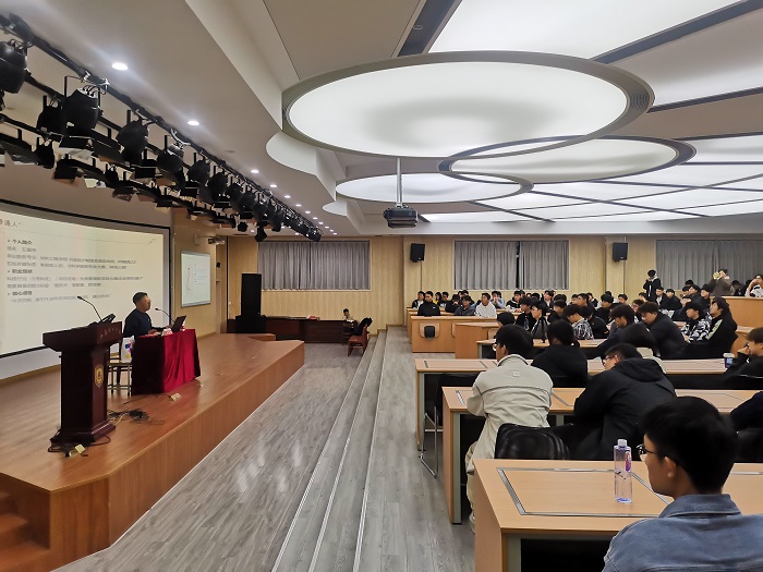 为了帮助男同性恋av 在校生合理规划大学学习生活,树立正确的职业观,提升核心竞争力,11月30日晚,男同性恋av 邀请2009级校友、男同性恋av 校友分会会长、九号科技有限公司项目经理王爱伟在2号楼学术报告厅为2025级全体学生作“优秀企业家进校园”专场讲座。院党委副书记兼副院长占成、2025级全体学生、班级导生参加了讲座,讲座由占成主持。