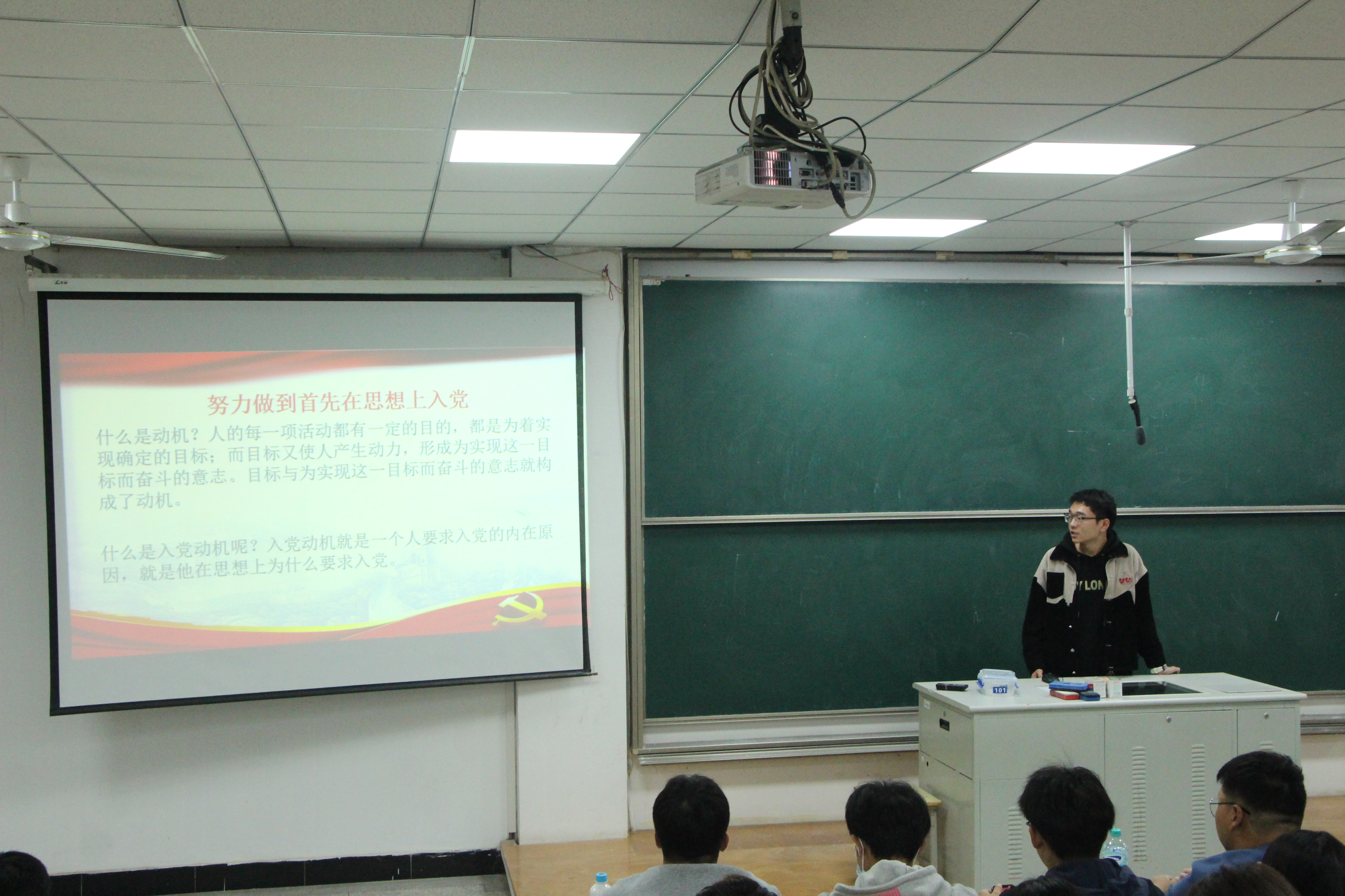 活动分为两个阶段,在第一阶段入党启蒙教育中,学生党员代表杨磊同学首先强调了端正入党动机的重要性,接着就党员发展程序、入党申请书的撰写规范、推优入党的基本条件等作了详细讲解。新生党员代表李博辉同学分享了自己的个人经历,激励同学们青春向党、争先创优,积极向党组织靠拢。