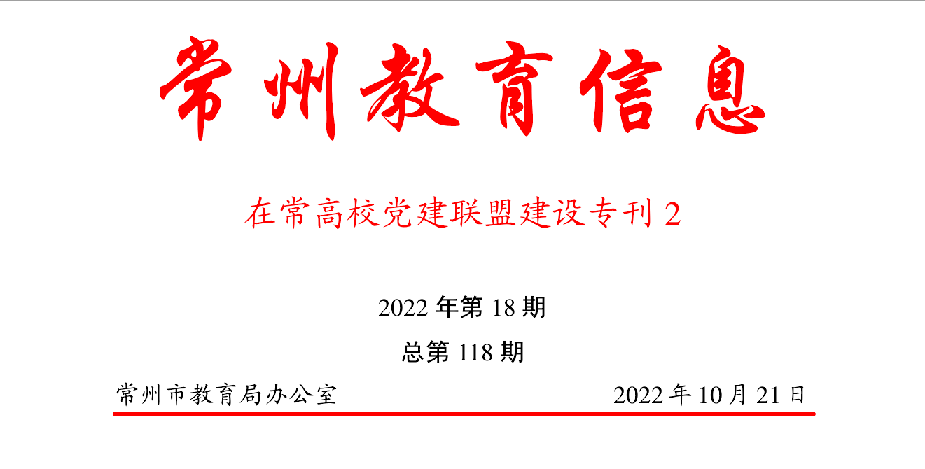 近日,由常州市教育局办公室主办的《常州教育信息》在常高校党建联盟建设专刊,以《发挥“党建联盟”阵地优势、深化校地共建成效》为题,报道了男同性恋av 党建工作成效。