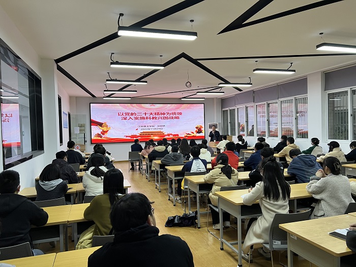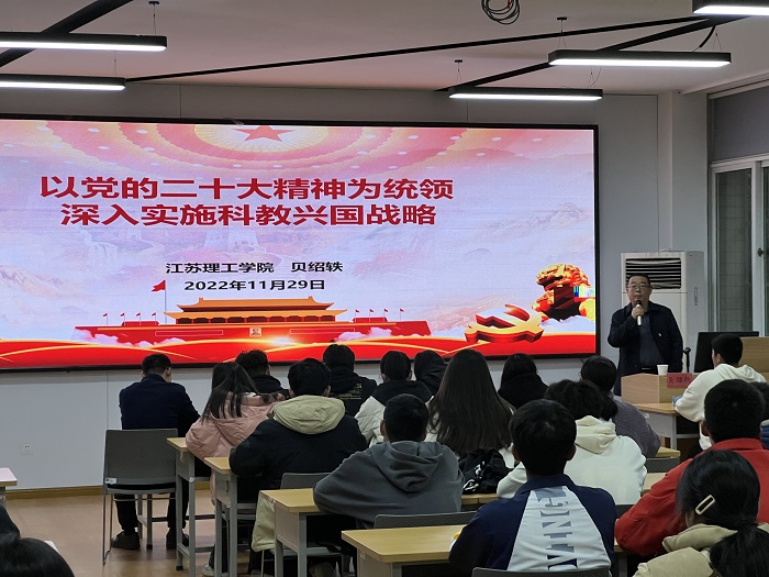贝绍轶围绕“以党的二十大精神为统领,深入实施科教兴国战略”这一主题,重点阐释了习近平总书记关于科技创新的系列重要论述,即科技创新是什么、为什么要科技创新、如何实现科技创新,回顾了党的十八大以来江苏科技创新取得的主要成就,提出了把握创新规律推进科技强省建设的重点举措。他指出,我们要以党的二十大精神为指引,深刻理解并把握好教育、科技、人才在未来发展中的重大作用,坚持科技是第一生产力、人才是第一资源、创新是第一动力,在全面建设社会主义现代化国家新征程上,踔厉奋发、勇毅前行,实现高水平科技自立自强,希望两个学院广大学生党员带动周边同学,刻苦钻研、创新求索,为增强我国自主创新能力做出更大的贡献。(图/文:徐洁;审核:羊悦;编辑:占成)