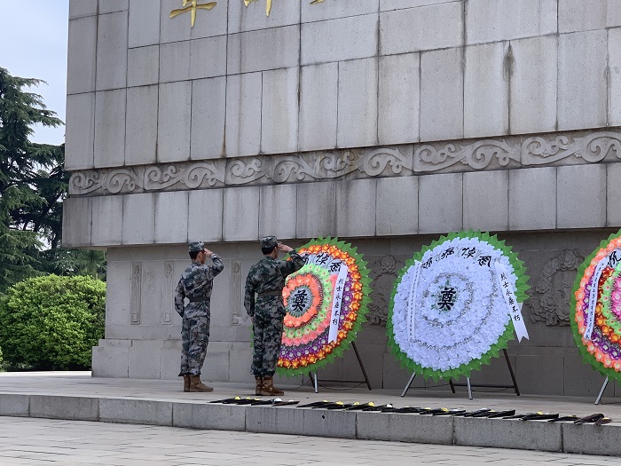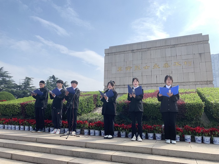 “魂兮归来,嘉名孔彰;魂兮归来,万古流芳。……人民英雄永垂不朽!“艰苦奋斗 强我中华”的精神永垂不朽!“学生代表致悼词,退役大学生代表向革命先烈敬献花圈,全体人员面向革命烈士纪念碑行鞠躬礼,祭英雄、致哀思。
