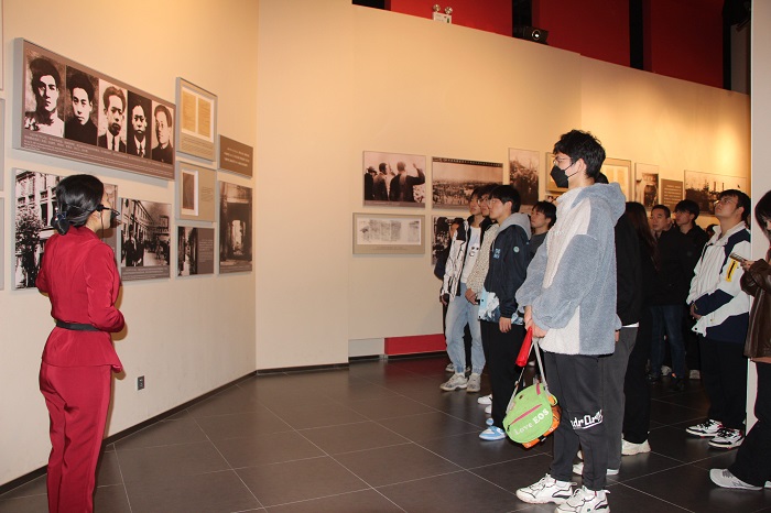 走进张太雷纪念馆,首先映入眼帘的是张太雷高大的雕像。雕像后凝铸着七个大字:“谋将来永远幸福”,这是张太雷的初心,更是他的信仰。纪念馆内的照片与文字,生动地向我们讲述了他充满无私奉献、追寻重要使命的一生。他高尚的品质令在场的人为之动容,心中源源不断涌起滚烫的热血。