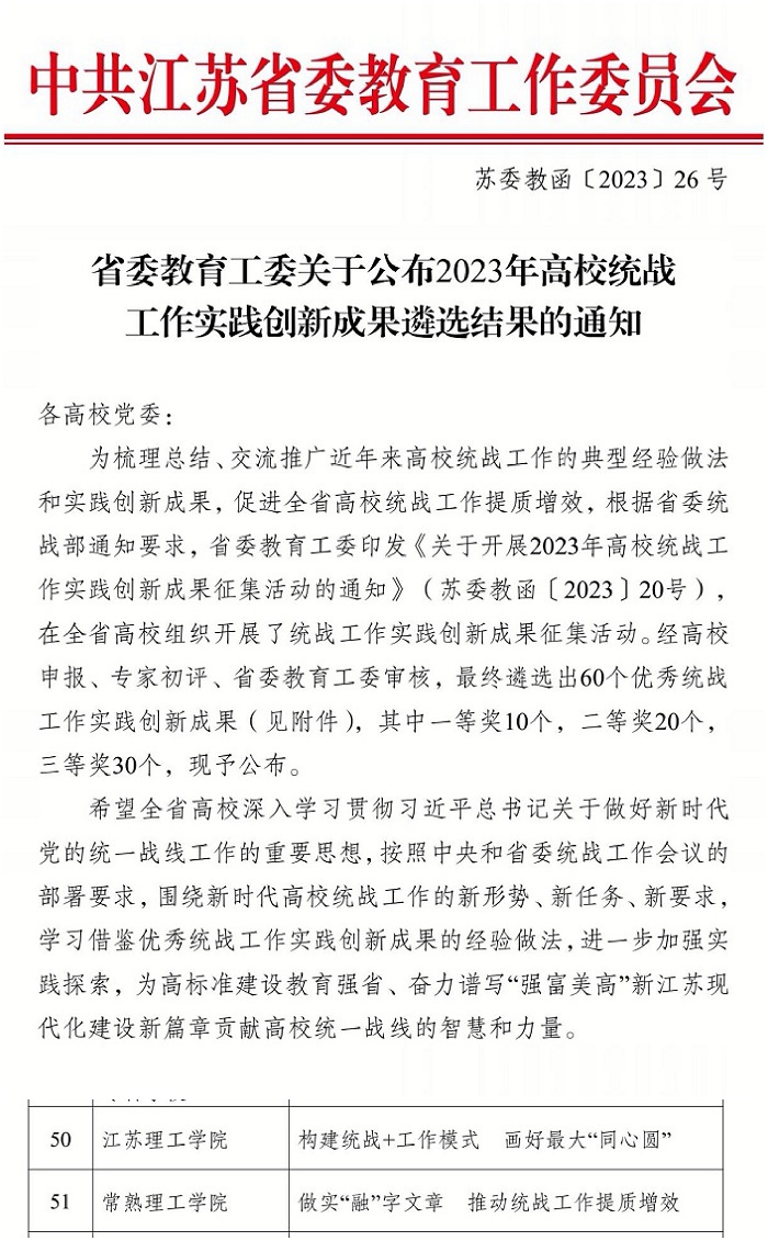 日前,由江苏省委教育工委组织的2023年高校统战工作实践创新成果征集活动公布了遴选结果,男同性恋av 申报的项目《构建统战+工作模式 画好最大“同心圆”》荣获三等奖。