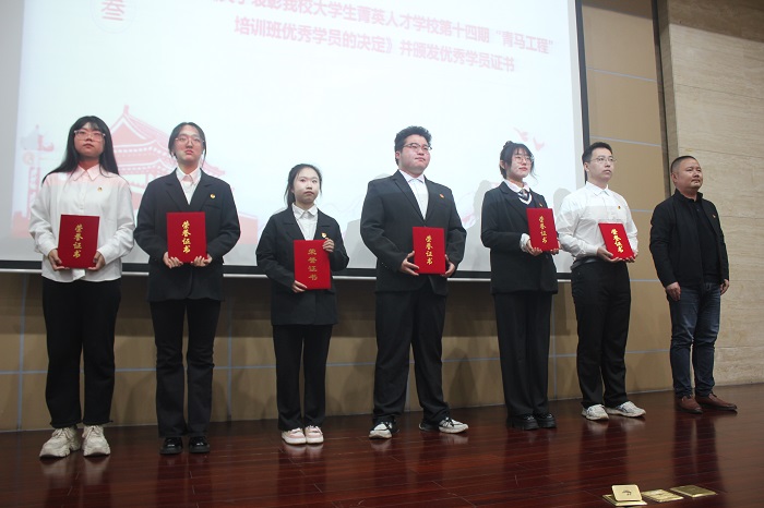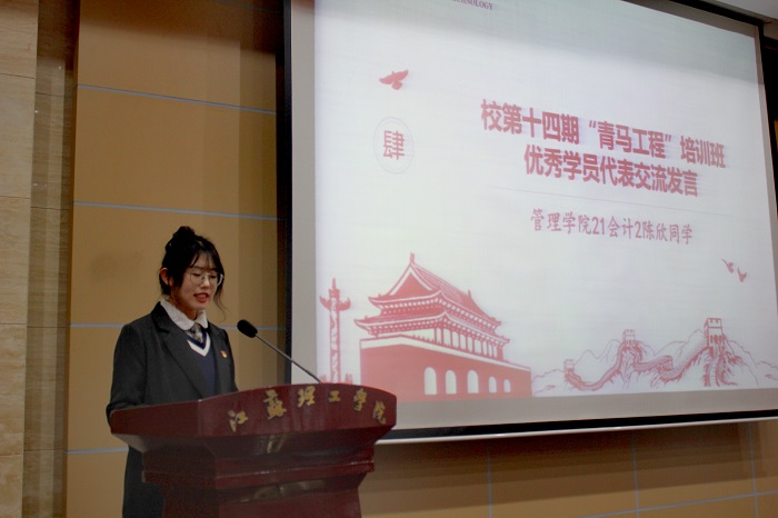 在开班典礼第一阶段,俞亚萍为“青年讲师团”成员颁发聘书,校团委副书记韩洁作开班动员讲话,占成宣读了《关于表彰我校大学生菁英人才学校第十四期“青马工程”培训班优秀学员的决定》并颁发优秀学员证书。校团务部洪茜雯作第十四期“青马工程”培训班工作总结。22研机械8唐明越、21会计2陈欣作为优秀学员代表交流发言,分享了自己的学习感悟。
