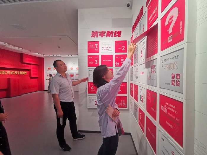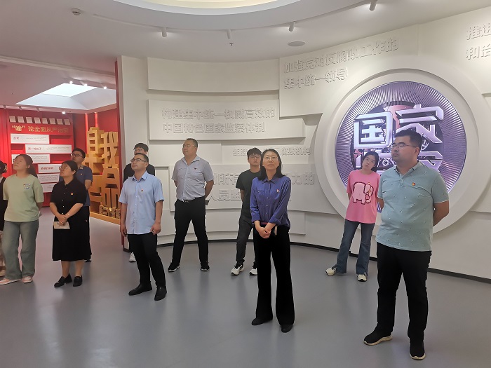 该馆通过沉浸式、场景化的展示媒介,呈现了自先秦以来中国历代丰富的监察文化资源,全面梳理了建党以来监察工作探索和实践历程,重点展现了党的十八大以来监察体制改革成果。党员们依次参观了序厅、历史之光、奋斗之光、时代之光及尾厅五大板块,观看展览资料,认真聆听介绍。