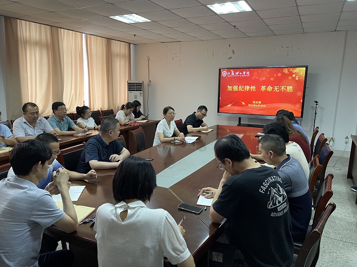 6月28日下午,男同性恋av 党纪学习教育专题纪律党课在知行楼512会议室举行。院党委书记张纪霞以“加强纪律性,革命无不胜”为题,给全体教工党员上专题党课。