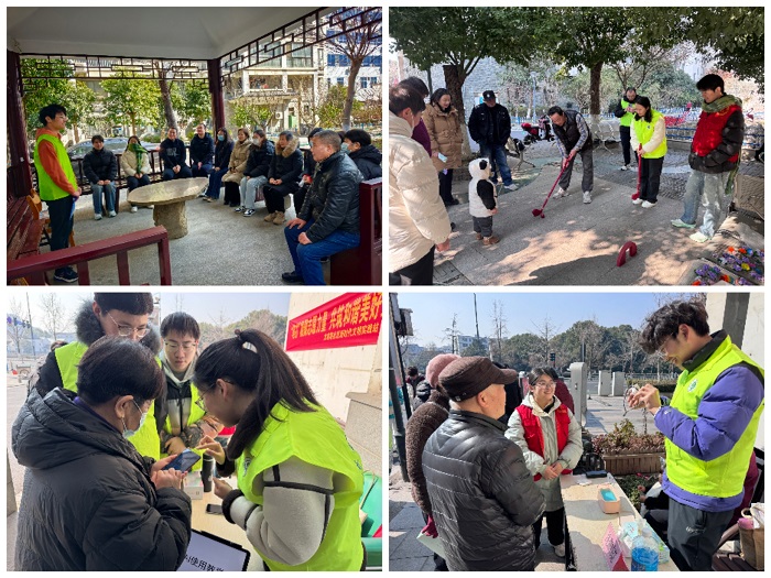 游戏互动区同样人气爆棚,志愿者们组织居民体验捶丸游戏。捶丸作为中国古代的传统球类运动,兼具趣味性与竞技性。在志愿者的指导下,居民们手持球杆,瞄准目标,挥杆击球,现场欢声笑语不断。游戏结束后,志愿者们还为居民送上了同学们亲手制作的手工作品,这些饱含心意的作品,赢得了居民们的一致好评。