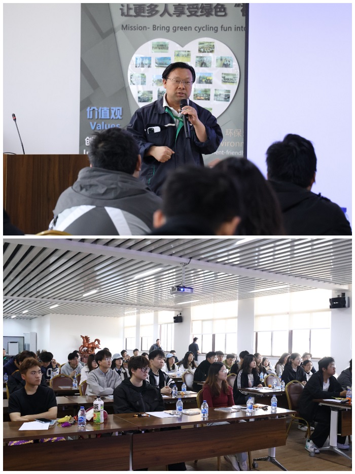 4点,永祺车业工程研发部经理程凯与学生们展开面对面交流。程凯不仅是企业技术骨干,还曾多次主导自行车设计项目,并在工会工作中推动职工权益保障。他结合自身经历,分享了制造业从传统生产向智能化转型的趋势,并建议学生:“保持终身学习能力,关注行业前沿技术,同时注重实践与理论的结合。”
