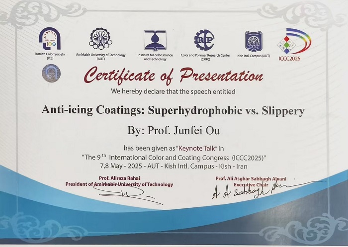欧军飞发表了题为《防冰涂层技术研究进展》的学术演讲,全面介绍了防冰材料领域的创新成果。所开发的新型防冰涂层,凭借其良好的耐久性和极低的黏附强度,引发了与会专家的热烈讨论及企业界代表的浓厚兴趣。会上,欧军飞还与阿米尔卡比尔理工大学国际事务代理副校长Roohollah Bagherzadeh教授围绕功能材料开发应用等方向展开对话,并就建立长期学术交流机制、共建联合实验室等后续合作事宜达成了初步共识。