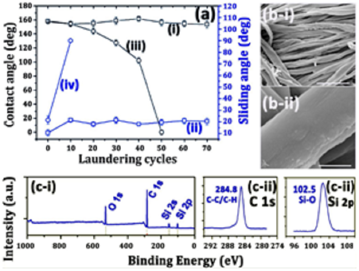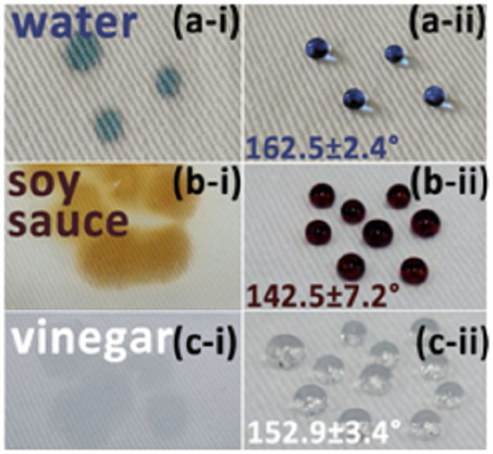本项目开发新型水基整理剂,对织物进行改性整理,使其具有优异的防水透气性能,水、酱油、醋、可乐等日常液体在其表面呈球形且迅速滚落。具有以下突出有点:
