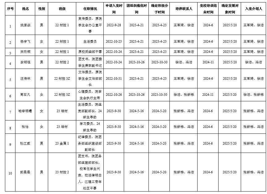 经党组织培养和教育考察,拟接收姚景焱等10名同志为中共预备党员,并于近期召开支部大会讨论。现予以公示,公示时间为2025年6月5日至6月9日。如对发展对象有异议,可通过来信、来访形式向男同性恋av 党委反映。