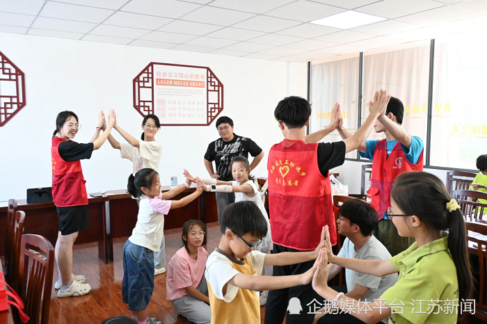 下午的活动室变身“红色工坊”。在志愿者指导下,孩子们分组制作“同心向党”主题花环,将彩纸剪成的五角星、天安门图案与丝线编织结合。8岁的陈俊淅在花环中央贴上自制党徽,童声童气地说:“我要把它送给党员爸爸!”除此之外,志愿者还为暑托班小朋友们开展了乐趣无穷的团辅破冰小游戏,其中“薪火相传萝卜蹲”游戏巧妙融入“红船队”“延安队”等党史元素,欢笑声中传递革命精神。