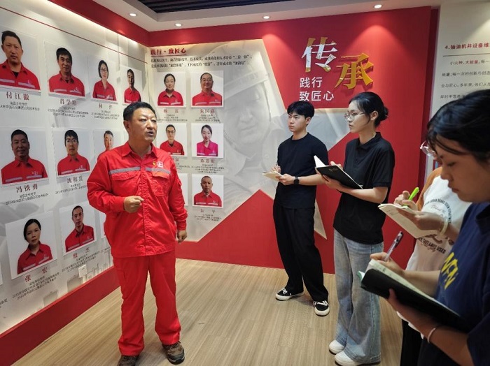 在中国石化红色教育基地“真6井”(江苏油田第一井),团队成员聆听了技术主管黄静篱讲述油田艰苦创业历程与“三老四严、四个一样”的优良传统,被她扎根基层的奉献精神深深打动。在真2站,集输工顾伟分享了油、气、水三相分离技术知识及其家族传承石油精神的动人故事。井控车间负责人王中军结合处理紧急情况的经历,为同学们上了一堂生动的“临危不乱、勇于担当”职业素养课。