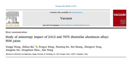 参考格式:Wang Y, Bai Z, Wang P, et al. Study of anisotropy impact of 2A12 and 7075 dissimilar aluminum alloys FSW joints[J]. Vacuum, 2025, 236: 114173.