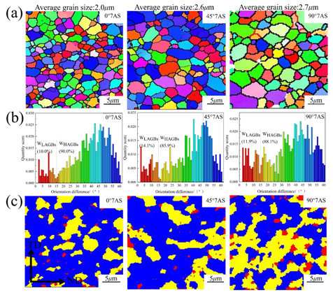 实验通过母材的RD、TD、ND方向微观组织和力学性能的差异,引入到不同前进侧材料和焊接方向对FSW接头组织和性能的影响。图1显示了不同焊接方向FSW接头NZ晶粒分布、大小角度晶界和回复再结晶能力。通过实验数据分析发现,沿轧制方向焊接时,焊核区晶粒尺寸最小、回复在结晶比例最高。同时,FSW接头的抗拉强度最高(为414MPa),达到2A12铝合金强度的87%。