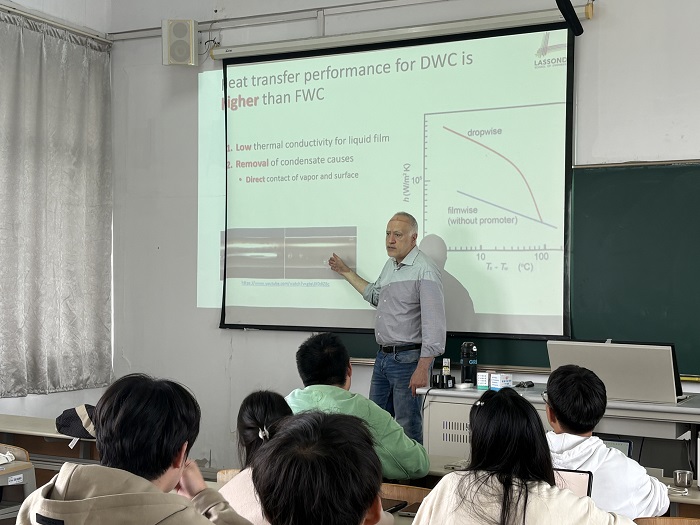 讲座从日常生活中常见的冷凝现象入手,Amirfazli院士引领同学们深入思考热传导的基本机制,细致对比了滴状冷凝与膜状冷凝在热传导效率上的显著差别,着重突出了滴状冷凝的优越性,并由此过渡到如何有效抑制或消除膜状冷凝以提升热传导性能这一前沿课题的深入探讨。Amirfazli院士凭借其幽默风趣且严谨细致的语言风格,将复杂的科学原理阐述得清晰透彻。同学们在互动环节踊跃提问,与Amirfazli院士展开了热烈而富有成效的交流,现场学术氛围浓厚。