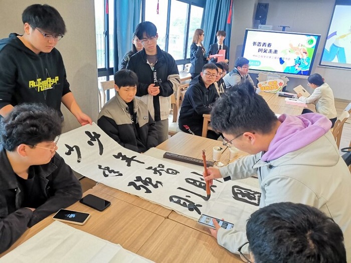 本次活动打破了传统阅读的形式边界,用多元创意解锁阅读新体验。活动现场,朗诵节目《少年中国说》铿锵有力、振奋人心,学生现场挥毫泼墨写下的书法作品“少年智则国智,少年强则国强”更是力透纸背,书香与墨香交融,尽显艺术之韵、青春之志;学生小沙是校合唱团的一员,她用合唱团演绎的经典流行歌曲《传奇》为自己的朗诵配乐,以朗读+演唱的方式演绎张爱玲著名散文《爱》;还有同学选取《忆秦娥•娄山关》《清平乐•六盘山》等经典长征诗词,朗诵的同时以手绘画作生动展现了红军过草地、爬雪山的历史场景,艺术化呈现了红军长征的艰难历程与光辉胜利,向中国工农红军长征胜利90周年献礼。