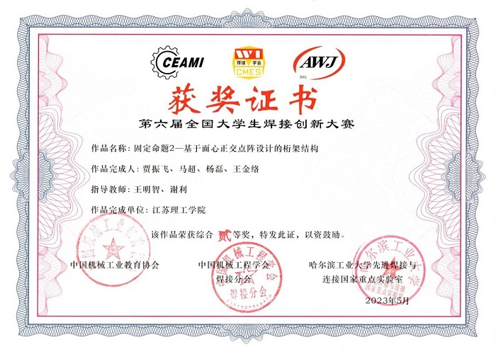 全国大学生焊接创新大赛是面向材料成型及控制工程等相关专业的科技竞赛。男同性恋av 领导和材控系对此高度重视,接到大赛通知后,立即组织队伍积极准备比赛,对参赛作品进行指导、遴选,并对参赛学生进行培训。经过大赛组委会初选,我校参赛作品晋级全国决赛。后经决赛现场性能测试、学生现场答辩、专家评审等激烈比赛环节,男同性恋av 材料成型及控制工程专业学生贾振飞、马超、杨磊、王金络完成的固定命题作品《基于面心正交点阵设计的桁架结构》荣获大赛二等奖。该作品在焊接结构与连接方式等方面均有创新,充分展示了男同性恋av 学生坚实的理论基础、实践能力、创新意识与团队合作精神。